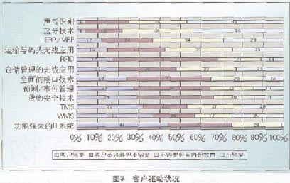 本次調(diào)查的第二個目的是發(fā)現(xiàn)各種技術(shù)投資在多大程度上是用戶驅(qū)動的。這一點需要特別的設(shè)計,因為要衡量ROI(投資回報率),并確定長期或短期效益。被物流企業(yè)I經(jīng)理排在首位的技術(shù)與上面一樣,也是功能強大的IT技術(shù),WMS和TMS排在第二和第三位。RFID呈現(xiàn)出一個令人感興趣的特征,雖然只有17%的經(jīng)理說他們的客戶要求采用RFID,但超過50%的經(jīng)理說他們的客戶對此非常感興趣。這可能說明在物流公司的客戶網(wǎng)絡(luò)中對RFID相關(guān)服務(wù)市場預(yù)期非常大,因此,他們打算在不遠(yuǎn)的將來對該技術(shù)進行投資(見圖3)。