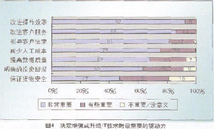 第三,RFID是使物流產(chǎn)業(yè)發(fā)生變革的下一代關(guān)鍵技術(shù)。調(diào)查顯示,許多物流公司的客戶對此很感興趣,而且物流公司本身也對該技術(shù)的成本與收益強烈關(guān)注。然而更重要的是,物流業(yè)正在尋求從該項技術(shù)的應(yīng)用中找到提高運營能力和效率的辦法。調(diào)查結(jié)果顯示,提高 操作效率是當(dāng)前物流業(yè)技術(shù)投資最重要的驅(qū)動力。