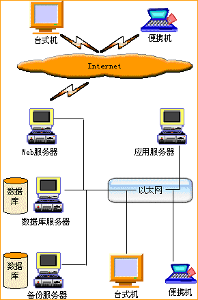 英泰X+i企業(yè)管理軟件可運(yùn)行在局域網(wǎng)或互聯(lián)網(wǎng)環(huán)境中,支持B/S結(jié)構(gòu)。系統(tǒng)的拓?fù)浣Y(jié)構(gòu)如下圖所示。