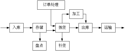 由成品下生產(chǎn)線開始,經(jīng)「入庫(kù)」作業(yè)確認(rèn)入庫(kù)貨品后,便依次將貨品入庫(kù)「存儲(chǔ)」。為確保在庫(kù)貨品受到良好的保護(hù)管理,需進(jìn)行定期或不定期的「盤點(diǎn)」檢查。當(dāng)接到客戶訂單后,先將訂單依其性質(zhì)作「訂單處理」,之后即可按處理后的訂單信息將客戶訂購(gòu)貨品從存貨區(qū)中取出,進(jìn)行「揀貨」作業(yè)。揀貨完成后,一旦發(fā)覺揀貨區(qū)所剩余的存量過低,則必須由存儲(chǔ)區(qū)或者由再生產(chǎn)來(lái)「補(bǔ)貨」。需加工的貨品,要運(yùn)送到加工區(qū)進(jìn)行加工。揀出的貨品和加工后的貨品經(jīng)整理后即可準(zhǔn)備「出庫(kù)」,等到一切出庫(kù)作業(yè)完成后,司機(jī)便可將出庫(kù)貨品裝上配送車,將之「運(yùn)輸」到各個(gè)客戶點(diǎn)交貨。