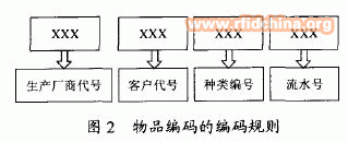 為實(shí)現(xiàn)真正的“一物一碼”,編碼原則采用了EPC(electron production code)碼[3] 。由于EPC碼是物品本身具有的屬性,即物品在出廠時(shí)會(huì)由生產(chǎn)廠商對(duì)其進(jìn)行EPC編碼,寫入到電子標(biāo)簽中。而EPC編碼是在生產(chǎn)廠商加入EPC global組織后,由組織給生產(chǎn)廠商分配一個(gè)編碼的空間以及一些編碼規(guī)則,讓企業(yè)自行編碼。本系統(tǒng)為方便操作,只定義了12位二進(jìn)制位的編碼。編碼規(guī)則如圖2所示。