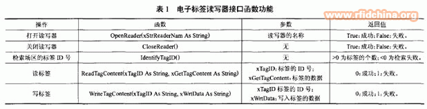 本文采用C#語(yǔ)言編程,通過(guò)調(diào)用基于COM 組件的In—terop.vtComRFID.d11動(dòng)態(tài)庫(kù)文件的5個(gè)主要接口函數(shù)實(shí)現(xiàn)物流控制及管理系統(tǒng)與讀寫器的通信,接口函數(shù)的主要功能如表1所示。通信內(nèi)容為物品編碼。