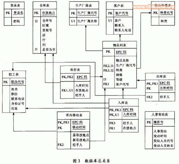 數(shù)據(jù)庫(kù)中表的關(guān)系如圖3所示。它描述了數(shù)據(jù)庫(kù)中所有的表以及這些表之間的關(guān)系。對(duì)于表之間的觸發(fā)器、為程序設(shè)計(jì)的存儲(chǔ)過(guò)程、約束等具體內(nèi)容這里沒有詳細(xì)列出。