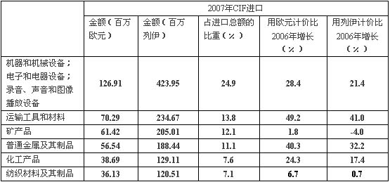 從市場(chǎng)結(jié)構(gòu)看,2007年,用列伊計(jì)價(jià)自歐盟其他26個(gè)國(guó)家的進(jìn)貨額同比增長(zhǎng)了22.3%(折合歐元計(jì)算同比增幅達(dá)29.5%),占到同期進(jìn)口總額的71.1%。