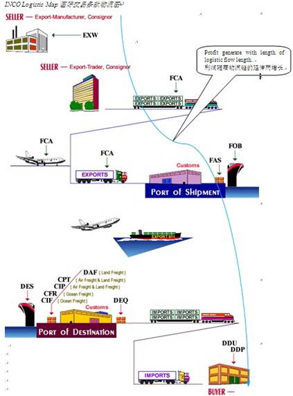 現(xiàn)實中,貨運代理是服務(wù)國際貿(mào)易的其中一個環(huán)節(jié),在貿(mào)易流當(dāng)中承擔(dān)物流的角色。因此,國際貿(mào)易的交易條款(INCO TERMS)也成為國際貨運的“圣經(jīng)”。筆者2006年在孟加拉的吉大港拜訪當(dāng)?shù)刎洿鷧f(xié)會的主席,也是當(dāng)?shù)睾_\學(xué)校的教授Mr。 Jasim U。 Ahmed。 他直接告訴筆者,離開交易條款而談的國際貨運都是一場笑話。這意味著,如果沒有海外代理,一個貨運公司可以做的只有本地的拖車、報關(guān)、派送服務(wù),而在交易條款當(dāng)中從E組、F組、C組及D組當(dāng)中的大部分業(yè)務(wù),甚至包括進口業(yè)務(wù)都是沒有能力進行的。在右圖當(dāng)中,整個貿(mào)易交易條款鏈條就是物流運輸鏈條,當(dāng)中的深度及廣度,決定了利潤的厚度。如果沒有海外代理,貨運企業(yè)的生命力是脆弱的,同時,面對占據(jù)國內(nèi)75%的FOB貨運市場,也只能“望洋興嘆”。