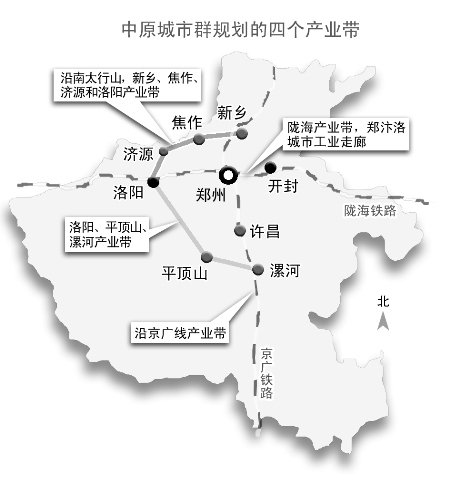 中原城市群共九個城市,以鄭州為中心,包括洛陽、開封、新鄉、平頂山、焦作、許昌、漯河和濟源。共規劃了四個產業帶:隴海產業帶,鄭汴洛城市工業走廊;沿京廣線產業帶;沿南太行山,新鄉、焦作、濟源和洛陽產業帶;洛陽、平頂山、漯河產業帶。