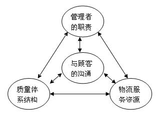物流服務(wù)質(zhì)量體系主要有管理者的職責(zé)、資源、質(zhì)量體系結(jié)構(gòu)三個關(guān)鍵方面,其關(guān)系見下圖。