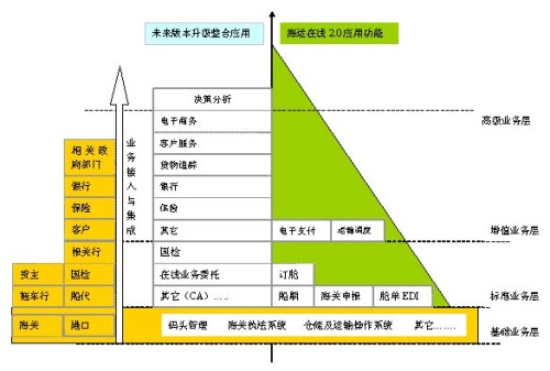 深圳海運(yùn)在線平臺(tái)不斷深入是深圳市海運(yùn)業(yè)務(wù)的發(fā)展及區(qū)域優(yōu)勢(shì)體現(xiàn)的過(guò)程,平臺(tái)業(yè)務(wù)及功能的完善保持在總體規(guī)劃的基礎(chǔ)上,結(jié)合區(qū)域海運(yùn)業(yè)務(wù)的發(fā)展戰(zhàn)略,深化實(shí)施。平臺(tái)應(yīng)用結(jié)構(gòu)包括基礎(chǔ)業(yè)務(wù)層、標(biāo)準(zhǔn)業(yè)務(wù)層、增值業(yè)務(wù)層和高級(jí)業(yè)務(wù)層,其中基礎(chǔ)業(yè)務(wù)層是構(gòu)建是目前海運(yùn)業(yè)務(wù)基礎(chǔ)設(shè)施及政府職能部門(mén)信息管理系統(tǒng)基礎(chǔ)上,而標(biāo)準(zhǔn)業(yè)務(wù)層是海運(yùn)業(yè)務(wù)電子作業(yè)操作的集成一體化應(yīng)用,增值業(yè)務(wù)層是發(fā)展區(qū)域海運(yùn)業(yè)務(wù)的信息化手段,隨著銀行及保險(xiǎn)業(yè)務(wù)進(jìn)入到海運(yùn)物流中來(lái),第三方的監(jiān)管業(yè)務(wù)需求將越來(lái)越明顯,高級(jí)業(yè)務(wù)層是支持和實(shí)現(xiàn)區(qū)域宏觀決策的數(shù)據(jù)分析保證。