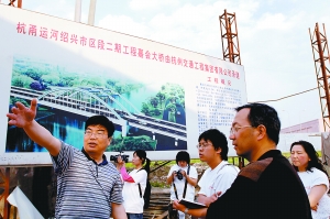 記者深入杭甬運(yùn)河紹興市區(qū)段二期工程工地采訪。