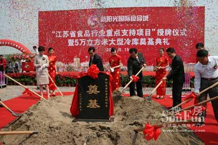 5月15日上午9點28分,在常州西林的新陽光國際食品城西南角,一項突破老食品市場傳統(tǒng)、有利于江蘇食品行業(yè)發(fā)展的創(chuàng)舉,新陽光國際食品城“江蘇省食品行業(yè)重點支持項目”授牌儀式暨5萬立方米大型冷庫奠基典禮,正在緊張的進(jìn)行中。