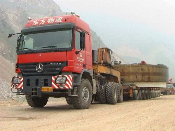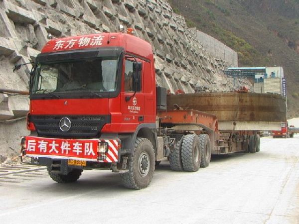 此次超寬大件運(yùn)輸任務(wù)共使用車輛7臺(tái),主車先后采用了先進(jìn)的沃爾沃FH12和奔馳Actros 3354等車型,27名隨車人員及時(shí)妥善處理沿途障礙、更換裝備等工作。由于所經(jīng)線路的路面、收費(fèi)站、樹木等障礙物較多,且該批部件屬108國道上運(yùn)輸?shù)淖顚挷考?dāng)?shù)亟痪氛块T高度重視,先后派出250人次進(jìn)行全程押運(yùn)護(hù)送;東方物流對(duì)不同的路段采用不同的裝車方式進(jìn)行運(yùn)輸:對(duì)轉(zhuǎn)彎半徑小的路段采取換裝方式,對(duì)收費(fèi)站和突巖采取避讓、繞道、搬移、挖掘等方式使其順利通過。