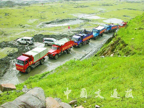 據了解,213國道都江堰至映秀段于17日下午搶通,不久后就因強烈余震中斷。17日19時左右,通往映秀的便道再次搶通,交通系統車隊隨即連夜出發。途中,暴雨導致山體滑坡,213國道都江堰至映秀段再次中斷。18日早晨,道路兩天內第三次被搶通。運輸車隊終于在闖過多處危險路段后,于18日13時30分,到達汶川縣映秀鎮。
