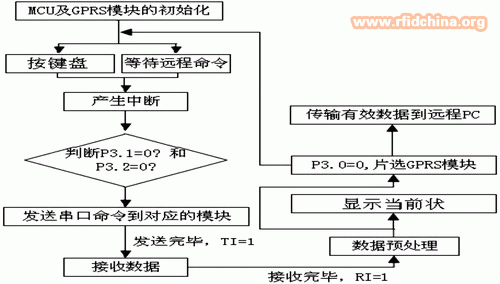 運行流程主要是數據采集、數據處理、數據傳輸和終端處理及反饋。單片機作為整個系統的控制核心,主要用于與3個功能模塊和遠程監控中心的通信。數據采集包括GPS模塊和RFID模塊的數據,通過串口傳入單片機進行預處理,顯示在 LCD上,同時通過GPRS模塊發送到遠程監控中心,進行終端處理分析。遠程監控中心也可以通過GPRS傳輸命令,向單片機發出提示、警告或獲取其他實時信息。