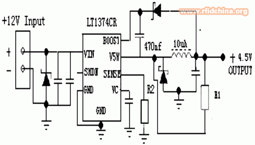 各功能模塊中, RFID射頻模塊(工作電壓為4.5v)對外圍電源電路要求具有穩壓功能和紋波小的特點。本系統中采用12V的輸入電源,由于輸入輸出電壓差比較大,所以線性調整器并不適用于該電壓轉換電路。為了衰減電流的峰值,必須使用100mF的旁路等效串聯電阻電容來保護電路,并且去耦電阻、去耦電容和電感也要盡可能地靠近模塊的電源輸入端口,其原理如圖3所示。