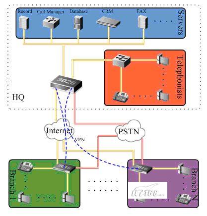 通過中心機房的Call Manager可以輕松組建基于IP的語音通信,同時也可以利用這套系統來組建分布式的呼叫中心,可以連通布置在全國的分支機構,從而為企業節省大量的語音通信費用。