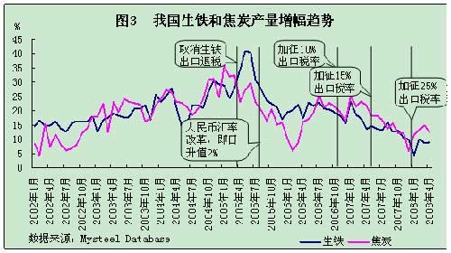 此同時,從2005年7月21日完善人民幣匯率機制改革后,人民幣兌美元匯率開始持續升值,至今累計升值幅度已超過16%。鋼鐵產品出口稅率的調整及人民幣升值對國內生產的增長形成較為明顯的抑制作用。