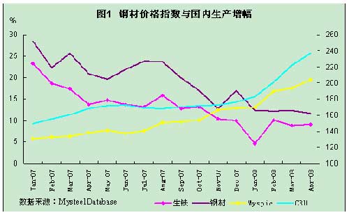 2008年以來,在原材料價格上漲帶動下,國內外鋼材價格出現加速上漲,但我國國內鋼鐵生產增長卻繼續回落,鋼材價格上漲無法刺激生產增長。如圖1所示,我國鋼鐵生產的增速從2007年就已經逐步回落,鋼材生產增幅從2007年1月份的28.5%下降到2008年4月份的11.7%,生鐵也從23.3%回落到9.1%,增幅下降均超過1倍。其中生鐵增速在進入2008年后低于兩位數,其低位運行抑制了鋼材生產的增長。