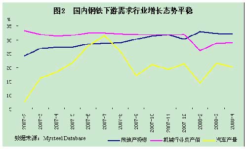 從國內需求來看,我們基本可以排除國內需求的抑制作用。就我國宏觀經濟運行態勢而言,雖然宏觀調控措施不斷,但主要對象是通貨膨脹,并且以數量型的存款準備金率為主;同時,宏觀調控還強調防止經濟增長出現快速回落。也就說,國內經濟依然能為鋼材消費提供較為堅實的基礎。從2007年至今國內下游行業的增長來看,固定資產投資,尤其是房地產投資增速依然保持了高位平穩運行態勢,對建筑鋼材等鋼材產品消費能夠提供足夠的支持;汽車、家電、造船及機械等高端消費行業雖然受到年初“雪災”天氣影響,但基本也保持在正常增長軌道內運行。見圖2。