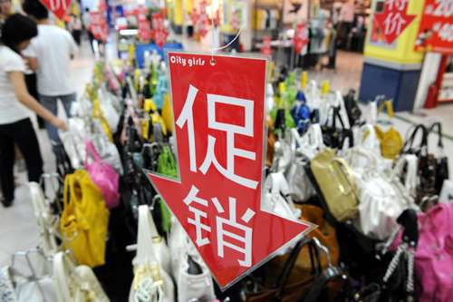 圖:5月份CPI同比漲幅比上月回落0.8%。在沈陽一家超市,顧客在選購皮包 (新華社)