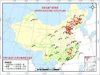 中國(guó)氣象局與交通運(yùn)輸部2008年6月24日聯(lián)合發(fā)布全國(guó)主要公路氣象預(yù)報(bào):