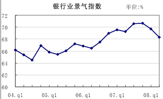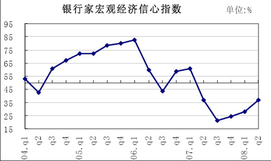 2008年第2季度,由中國人民銀行和國家統(tǒng)計局共同完成的全國銀行家問卷調(diào)查顯示:銀行家宏觀經(jīng)濟(jì)信心指數(shù)回升,預(yù)計下季宏觀經(jīng)濟(jì)運(yùn)行趨好;銀行業(yè)景氣指數(shù)高位回落,潛在風(fēng)險值得關(guān)注。