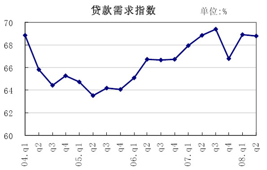 繼2008年第1季度貸款需求指數(shù)大幅反彈后,本季此指數(shù)繼續(xù)保持高位,達(dá)68.8%,為2004年調(diào)查以來的同期最高值。從貸款行業(yè)分類看,農(nóng)業(yè)、制造業(yè)與非制造業(yè)貸款需求指數(shù)均處于較高位置,并創(chuàng)同期新高,但非制造業(yè)中的房地產(chǎn)業(yè)、建筑業(yè)貸款需求指數(shù)回落突出。從不同貸款用途看,企業(yè)經(jīng)營周轉(zhuǎn)類用貸款需求指數(shù)增長,個人消費(fèi)貸款需求指數(shù)全面下降,其中個人購房貸款需求指數(shù)降幅明顯。從貸款對象看,大型企業(yè)貸款需求指數(shù)上升,中、小型企業(yè)貸款需求指數(shù)下降。