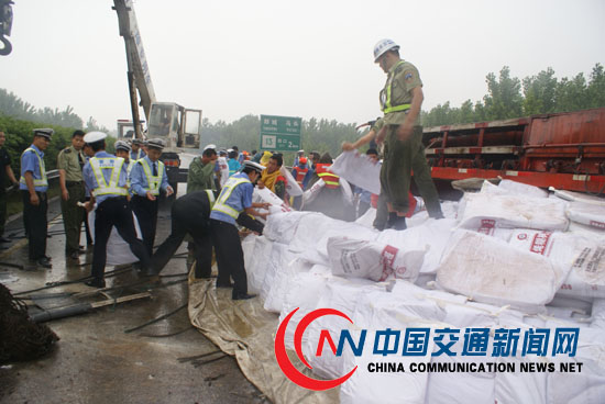 6月3日,高速公路管理部門和高速公路交警共30多名人員,經(jīng)過近3個小時的冒雨緊急施救,成功將京滬高速公路K225+400米處發(fā)生的車輛側(cè)翻,2000袋化工原料危險品散落造成交通堵塞情況化險為夷,確保了京滬高速公路大動脈的暢通。