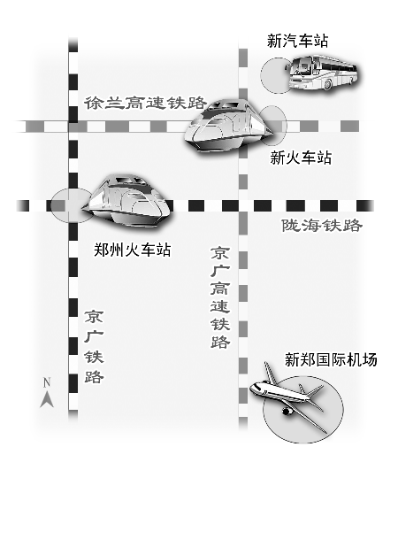 京廣客運專線和徐蘭(徐州至蘭州)客運專線將在鄭州新火車站交會,再加上現(xiàn)有的隴海、京廣兩大鐵路干線,鄭州是全國唯一的鐵路“雙十字”交會地。