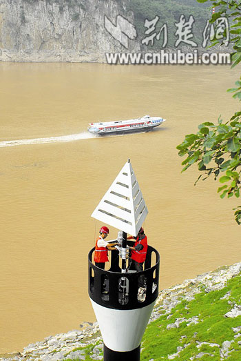 7日,采用GPS定位系統(tǒng)進(jìn)行遙測(cè)監(jiān)控的新型塔標(biāo),在三峽庫(kù)區(qū)投入使用。此航標(biāo)在長(zhǎng)江左岸呈黑白色調(diào),右岸呈紅白色調(diào)。據(jù)介紹,三峽庫(kù)區(qū)共有129座。圖為技術(shù)人員在三峽庫(kù)區(qū)左岸廟河水域岸邊的塔標(biāo)上調(diào)試航標(biāo)燈。