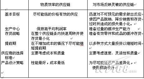 表一:具有物質效率的供應鏈和對市場反映靈敏的供應鏈的比較
