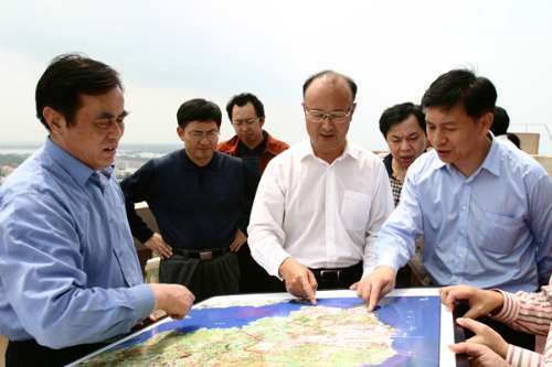 圖:洋浦開發(fā)區(qū)管理局局長丁尚清(中)在向海南省副省長姜斯憲(右)介紹開發(fā)區(qū)情況