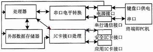 圖2.4所示為通過PC機控制管理的外置于PC機的接觸式CPU IC卡讀寫器。通過定制的數(shù)據(jù)線,該讀寫器的5V直流電源可直接由鍵盤口提供,同時數(shù)據(jù)線還負責PC機與讀寫器的串行數(shù)據(jù)交換。在大部分IC卡讀寫應用中,都涉及到IC卡的認證和數(shù)據(jù)讀寫的國解密問題,所以本讀寫器除了提供一個供用戶使用的IC卡接口卡座外,還內置了一個SAM卡,即安全IC卡卡座,以方便安裝SAM卡,保證應用IC卡讀寫時的數(shù)據(jù)安全,保護用戶的利益。