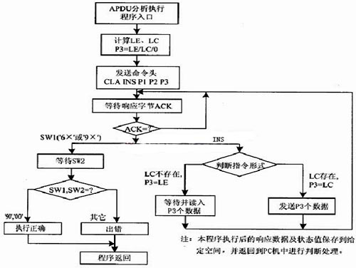 根據(jù)目前CPU卡的常用T=0協(xié)議、自帶編程升壓電路的應用情況,以及本讀寫器接收IC卡數(shù)據(jù)報文直接發(fā)送PC機處理的特點,本讀寫器可行的APDU命令和響應的處理流程如圖2.3所示。