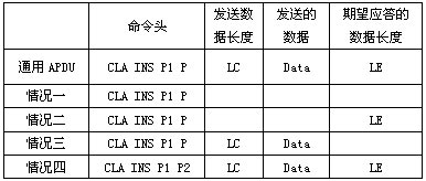應用層即為由CLA、INS、P1、P2、P3作為命令頭組成的命令消息體的APDU響應和應答處理層。其中CLA為指令類別,INS為指令碼,P1、P2為參數(shù),P3為根據(jù)APDU的不同格式為發(fā)送給卡的數(shù)據(jù)長度或期望響應的數(shù)據(jù)長度。APDU的幾種情況如表2.2所列。