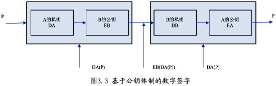 在某些場合為使簽字過程更加簡單,同時為保證簽字的有效性,利用公鑰加密算法也可以搭建數(shù)字簽字系統(tǒng),如圖3.3所示,如果A否認了發(fā)送給B的消息,B可以拿出DA(P),并用A的公鑰EA解密得到P,從而正明P是A發(fā)送的。如果B把消息P竄改了,當A要求B出示原來的DA(P)是,B拿不出來。達到消息簽字的目的。