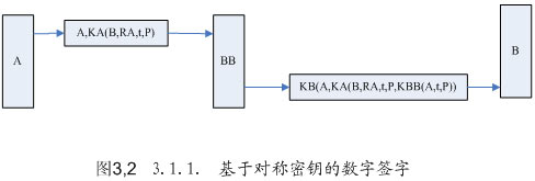 這種系統(tǒng)如圖3.2所示,設BB是A和B共同信賴的仲裁者,KA和KB分別為A和B與BB之間的密鑰,而KBB是只有BB掌握的密鑰,P是A發(fā)給B的消息,t是時間戳。BB解決了A的報文{A,RA(B,RA,t,P)}以后產生了一個簽名的消息KBB(A,t,P),并裝配成發(fā)給B的保溫{KB(A,RA,t,P,KBB(A,t,P))}。B可以解密該報文,閱讀消息P,并保留證據(jù)KBB(A,t,P)。由于A和B之間的通信是通過中間人BB的,所以不必懷疑對方身份。又由于證據(jù)KBB(A,t,P)的存在,A不能否認發(fā)送消息P,B也不能改變得到的消息P,因為BB仲裁時可能會當場解密KBB(A,t,P),得到發(fā)送人,發(fā)送時間和原來的消息P。