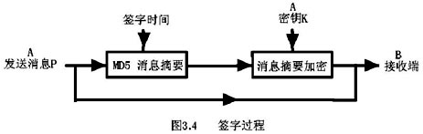 首先A將消息P與簽字時間拼接,形成新用于驗證發(fā)送消息的信息,在經過MD5雜湊算法計算出消息摘要,成為用于驗證消息時的消息指紋。同時A使用自己的密鑰K對該消息進行加密后連同原P消息一同發(fā)送給B。完成對消息簽字的過程。