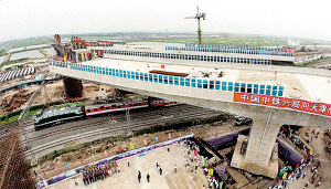 今天8:50,通過千斤頂的拉動,集疏港公路一期(東段)跨津山鐵路橋的兩座平行建設的橋體開始進行“轉體”,安裝在兩側橋墩下的球鉸分別帶動各自重13300噸、長122米的橋體轉動,從南北向轉為東西向,轉體角度達75度。70分鐘后,橋體成功完成對接。這座橋不僅是華北地區體量最大的轉體橋,同時也是目前我國最大的軟土地基施工的轉體橋。