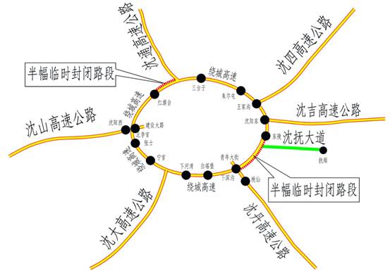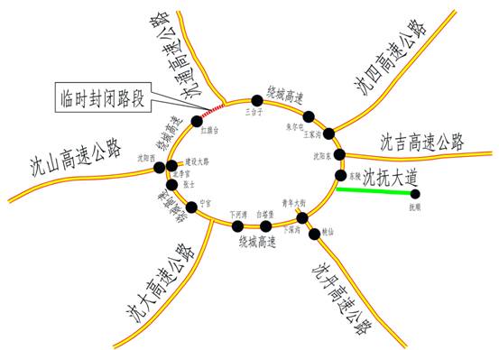 由沈四、沈吉去往沈山、沈大的車輛需通行東環、南環;因同期石廟子立交改造工程施工,由沈山、沈大去往沈四、沈吉的車輛請通行西環、北環。所有去往沈通的車輛要繞行東環、北環,沈通去往其它線路的車輛均需繞行北環、東環。