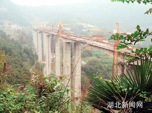 滬蓉西高速公路沿途有7處橋梁,其設(shè)計(jì)和施工難度在國內(nèi)和世界都屬一流,可稱為一個(gè)大型的橋梁博物館。其中水南特大橋?yàn)榫控制性重點(diǎn)項(xiàng)目之一,該橋分左右兩幅獨(dú)立成橋,左橋長919.92米,右橋長955.65米。主橋?yàn)?60+5*110+60)m變截面單箱單室懸澆連續(xù)箱梁,是滬蓉西高速公路全線11座同類型橋梁中連續(xù)剛構(gòu)箱梁跨數(shù)最多的橋梁。引橋?yàn)?0m后張法預(yù)應(yīng)力T型梁,大橋右幅8號墩人工挖孔深度達(dá)108米,為世界最長人工挖孔樁,全橋共有12個(gè)高墩,最高墩達(dá)98米。