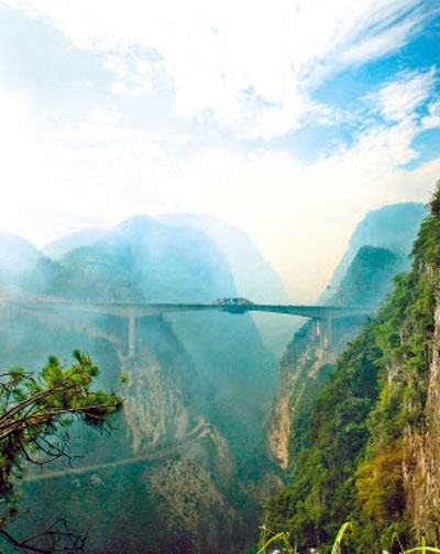 它就是沿溪溝大橋,橋面距谷底280米,比2004年通車、號稱“世界之最”的法國米約大橋還高10米;次之的重慶“第二高橋”橋面與谷底距離為263米,也在“世界高橋”中位居前列。
