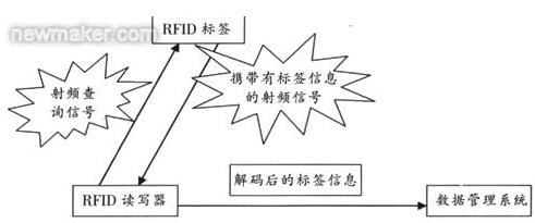 無(wú)線射頻識(shí)別(Radio Frequency Identification,RFID)是一種非接觸式的自動(dòng)識(shí)別技術(shù),通過(guò)射頻信號(hào)自動(dòng)識(shí)別目標(biāo)對(duì)象并獲取相關(guān)數(shù)據(jù)。通常,RFID系統(tǒng)由電子標(biāo)簽、讀寫(xiě)器和數(shù)據(jù)管理系統(tǒng)這三個(gè)主要部分組成: 電子標(biāo)簽由天線和RFID芯片組成,每個(gè)芯片都含有唯一的識(shí)別碼,用來(lái)表示電子標(biāo)簽所附著的物體;讀寫(xiě)器用來(lái)讀寫(xiě)電子標(biāo)簽中的信息,讀寫(xiě)器通過(guò)網(wǎng)絡(luò)和其他計(jì)算機(jī)或系統(tǒng)通訊,從而完成對(duì)電子標(biāo)簽的信息獲取、解釋以及數(shù)據(jù)管理;數(shù)據(jù)管理系統(tǒng)主要完成數(shù)據(jù)信息的存儲(chǔ)及管理,數(shù)據(jù)管理系統(tǒng)可以由簡(jiǎn)單的小型數(shù)據(jù)庫(kù)擔(dān)當(dāng),也可以是集成了RFID管理模塊的大型ERP數(shù)據(jù)庫(kù)管理軟件。其工作原理:標(biāo)簽進(jìn)入磁場(chǎng)后,接收讀寫(xiě)器發(fā)出的射頻信號(hào),憑借感應(yīng)電流所獲得的能量發(fā)送出存儲(chǔ)在芯片中的產(chǎn)品信息(Passive Tag,無(wú)源標(biāo)簽或被動(dòng)標(biāo)簽),或者主動(dòng)發(fā)送某一頻率信號(hào)(Active Tag,有源標(biāo)簽或主動(dòng)標(biāo)簽),讀寫(xiě)器讀取信息并解碼后,送至數(shù)據(jù)管理系統(tǒng)進(jìn)行有關(guān)信息處理。RFID系統(tǒng)的工作原理如圖1所示。