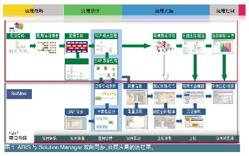 工具和方法都已準備妥當,那如何將其與企業的獨特需求結合起來并落地實現呢?需求的實現將通過ARIS系統平臺與SolutionManager系統協同應用來實現。在圖1所示的流程圖中,紅色邊框區域表示在ARIS軟件平臺中實現的業務功能,藍色邊框區域表示在SolutionManager中實現的功能,背景為淺藍色的區域是ARIS與SolutionManager共同應用,協同完成的功能。ARIS與SolutionManager的協同是通過雙向同步的方式來實現兩個系統間的有效集成,進而滿足業務和系統實現匹配和實施的需求。