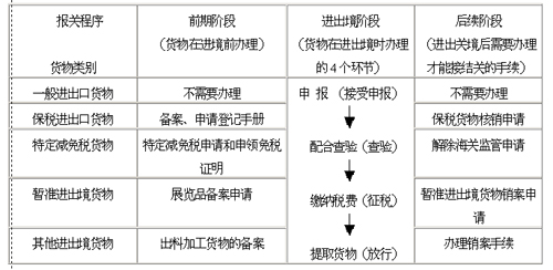 不同的貨物,報(bào)關(guān)程序也不同。總的來(lái)說(shuō),報(bào)關(guān)過(guò)程分三個(gè)大的階段:前期階段、貨物進(jìn)出境階段、后續(xù)階段。其中貨物進(jìn)出境階段是所有貨物必經(jīng)的程序,而前期階段、后續(xù)階段是對(duì)除了一般進(jìn)出境貨物以外的進(jìn)出境貨物才需補(bǔ)經(jīng)歷的階段。歸納圖表如下: