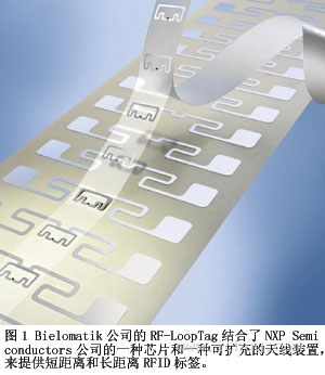 多數(shù)較新型RFID體系結(jié)構(gòu)的開發(fā)者都把低成本轉(zhuǎn)發(fā)器(或稱標(biāo)簽)作為體系結(jié)構(gòu)的基礎(chǔ),它們由一塊用于數(shù)據(jù)存儲與通信的IC以及一根外部天線組成。標(biāo)簽有兩個基本類型:無源型和有源型。無源標(biāo)簽不含電源,并依靠來自閱讀器的射頻信號在天線中感生小電流,該電流足以發(fā)射響應(yīng)信號。RFID標(biāo)簽通過改變來自閱讀器的射頻信號的反射能量大小來發(fā)射數(shù)據(jù)。無源標(biāo)簽的工作距離可達(dá)30英尺,這取決于閱讀器的功率輸出、天線結(jié)構(gòu)、工作頻率。Bielomatik公司的RF-LoopTag是一種可擴(kuò)充的天線裝置,同時提供短距離和中距離無源RFID標(biāo)簽(圖1)。