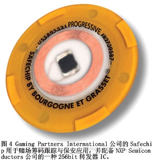 嵌入式RFID技術(shù)還非常適合于快速桌面賭博,其中的作弊和手法是難以檢測的。借助適當(dāng)?shù)臄?shù)據(jù)記錄工具,賭場經(jīng)營者就能監(jiān)視參賭者的行動,以便檢測撲克牌的計數(shù),調(diào)整獎勵,并盡量減少發(fā)牌者的錯誤。例如,International Game Technology公司和Progressive Gaming International公司聯(lián)合開發(fā)了Table iD桌面賭博自動化系統(tǒng),它結(jié)合了一個基于軟件的桌面管理器和一系列RFID芯片掃描模塊。最新的RFID賭博芯片工作于13.56 MHz,存儲容量超過10 kbit。在賭博期間,每個位置的芯片閱讀器識別并記錄每個參賭者的賭注。Table iD系統(tǒng)計算參賭者的下注模式,總結(jié)發(fā)牌者的活動,并且每小時記錄一次參賭者所做的決定。該系統(tǒng)無需用戶干預(yù)就能自動更新平均賭注和輸贏記錄等信息。有幾家供應(yīng)商在制造適合于賭桌自動化并基于RFID的賭幣。例如,Gaming Partners International公司在生產(chǎn)Safechip by Bourgogne et Grasset(圖4)。