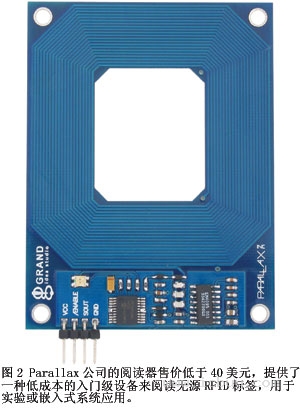 多數(shù)嵌入式RFID應(yīng)用都需要一種專用閱讀器作為設(shè)計的一部分,以便解釋本地標(biāo)簽。自動售貨機(jī)很好地說明了嵌入式RFID應(yīng)用。這種機(jī)器能借助內(nèi)置閱讀器來接受RFID卡的非接觸支付。另外,如果發(fā)售的物品有標(biāo)簽,則機(jī)器還能了解其庫存,以便自動訂購補(bǔ)貨。小型低成本嵌入式閱讀器對于這些應(yīng)用很關(guān)鍵,TI、SkyeTek、Parallax等公司供應(yīng)此類閱讀器。例如,Parallax公司與Grand Idea Studio公司合作開發(fā)的一種低成本RFID閱讀器模塊在無源轉(zhuǎn)發(fā)器標(biāo)簽中工作,用于門禁、自動識別、機(jī)器人、導(dǎo)航、庫存跟蹤、支付系統(tǒng)、轎車發(fā)動機(jī)防盜鎖等應(yīng)用 (圖2)。該模塊具有2400bps串口,并需要5V直流電源。Parallax閱讀器起價低于40美元。