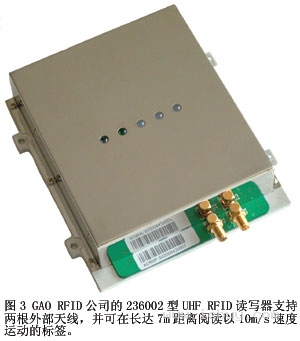 對于更耐久的應(yīng)用或工業(yè)應(yīng)用,GAO RFID公司提供一種UHF RFID讀寫器,它支持兩根外部天線(圖3)。236002型工作于902MHz~928MHz頻帶,面向高速倉儲、分銷、制造應(yīng)用。該模塊能在7m距離識別以10m/s速度運動的物體。該模塊需要12V直流電壓,并通過串行RS232或以太網(wǎng)接口通信。