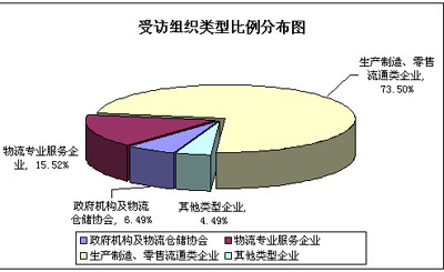 在6532份有效問卷中,各地政府機構及物流倉儲協會占6.49%,為424家;各類型企業占93.51%,為6108家。在接受調查的6108家企業中,物流專業服務企業有1014家,占有效受訪問卷總比的15.52%,生產制造、零售流通類企業有4801家,占總比73.5%,其他類型企業有293家,占總比4.49%。