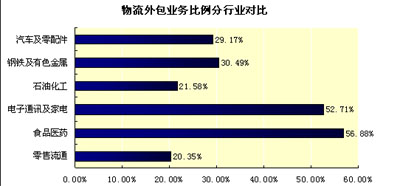 調查數據顯示,食品醫藥業、電子通訊及家電業,外包物流占比分別為56.88%和52.71%,相比之下,石油化工、鋼鐵及有色金屬、汽車及零配件行業的物流業務外包比例稍低,在25%左右徘徊,而零售流通業企業外包物流業務的比例最低,為20.35%。